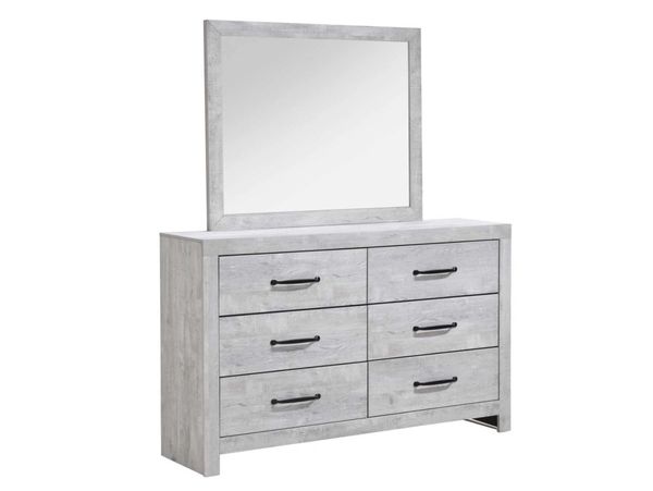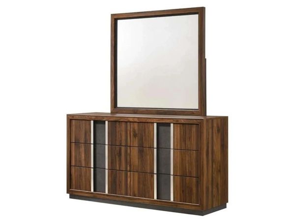 The Sandra 6-Drawer Dresser with Mirror is a modern and functional piece. Featuring 6 drawers, a large mirror, and a rustic modern look, this dresser is a perfect addition to any bedroom. The walnut tone and defined wood grain add a natural accent to any space.