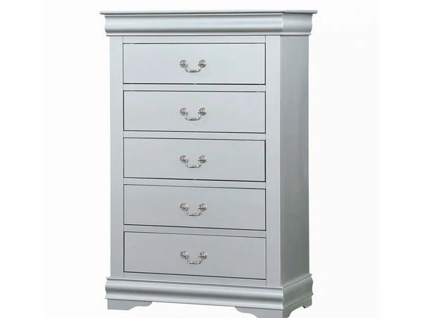 The Louis Philippe Chest is a classic and elegant piece. With 5 drawers, a center metal glide drawer, and brushed nickel metal handles, this chest offers both style and functionality.