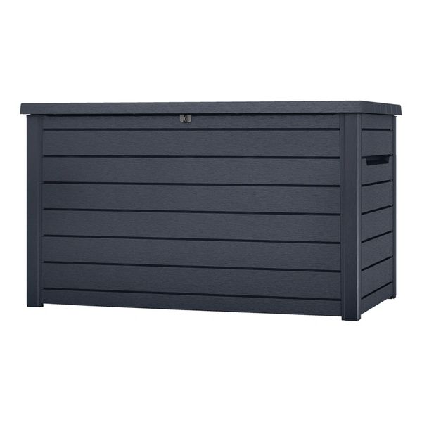 The Keter Wood-Look Outdoor Storage Deck Box is a spacious and durable storage solution. It offers approximately 870 liters of storage space and features a gas lift for easy opening. The box is UV and weather-resistant and can be locked for added security.