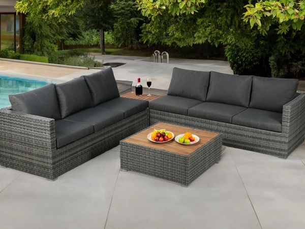 The Albany Wicker Dining Set is a stylish and comfortable outdoor furniture set made of durable man-made rattan. It includes a dining table, a three-seater sofa, two one-seater sofas, and two stools. The set features thick, comfortable cushions and a durable, patterned, hardwood table top.