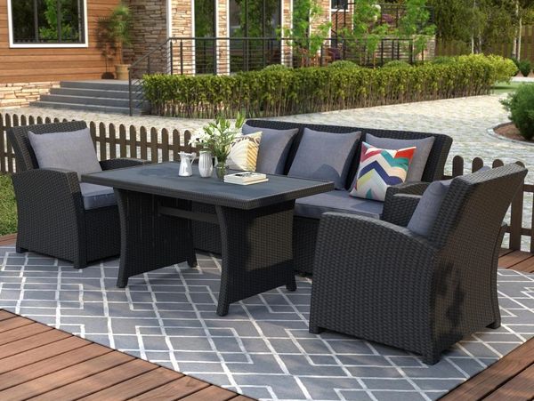 The Orly Outdoor Wicker Set is a versatile set that can be used for dining or lounging. It features a rectangular table and four chairs with plush cushions, offering a comfortable and stylish outdoor seating option.